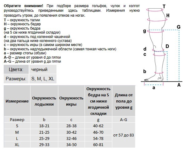 Обратите внимание! При подборе размера гольфов, чулок и колгот руководствуйтесь приведенными здесь таблицами. Измерения нужно проводить утром, до появления отеков на ногах.