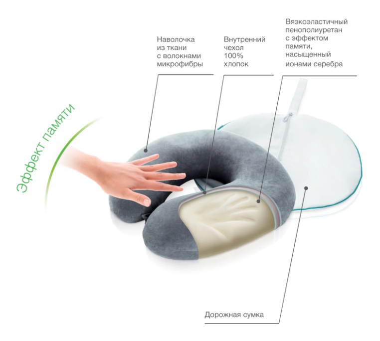 • Эффект памяти позволяет подушке адаптироваться к индивидуальной форме головы и шеи;