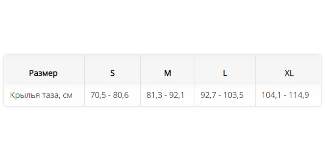 | Крылья таза, см | 70,5 - 80,6 | 81,3 - 92,1 | 92,7 - 103,5 | 104,1 - 114,9 |