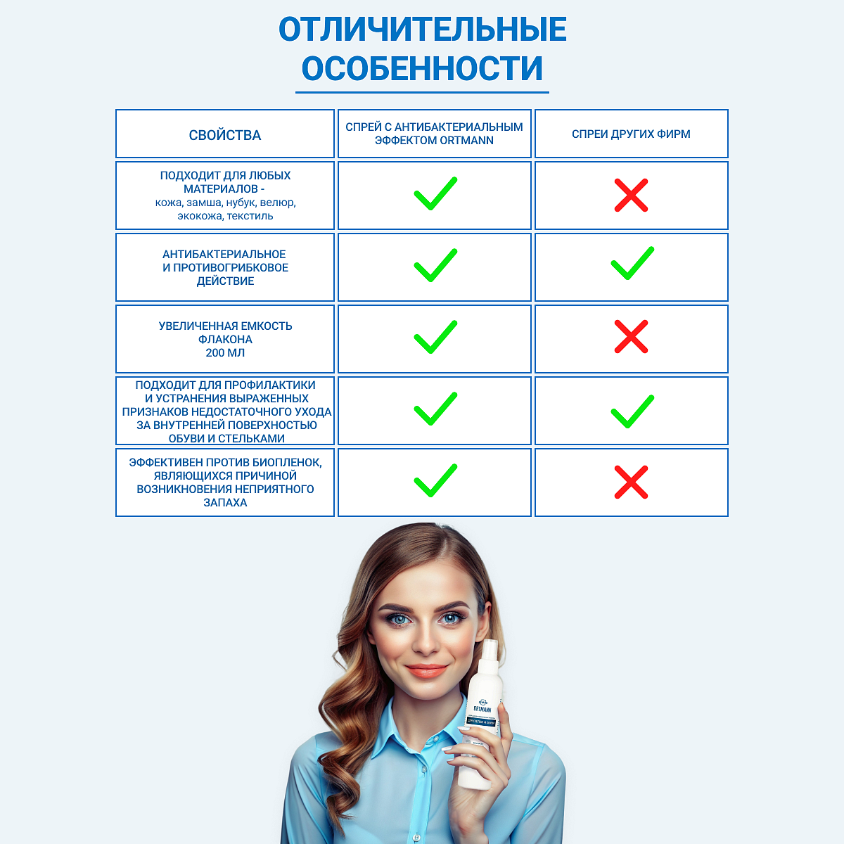 Спрей для стелек и обуви ORTMANN с антибактериальным эффектом – это спрей, оказывающий комбинированное очищающее, антибактериальное и противогрибковое действие.
